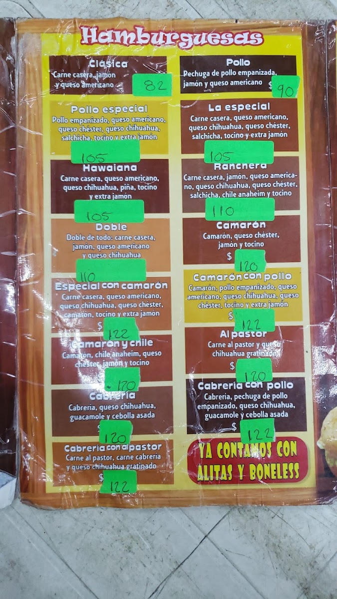 Hamburguesa con carne casera, carne de cabrería, camarón, pollo, queso chihuahua, tocino, verdura de temporada, aderezos de la casa y papas francesas.