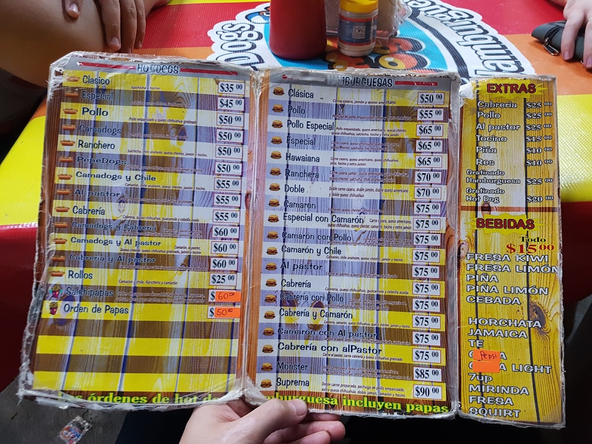 Hot dog con pollo, camarón, carne de cabrería, queso, jamón, tocino, verdura de temporada y aderezos de la casa.